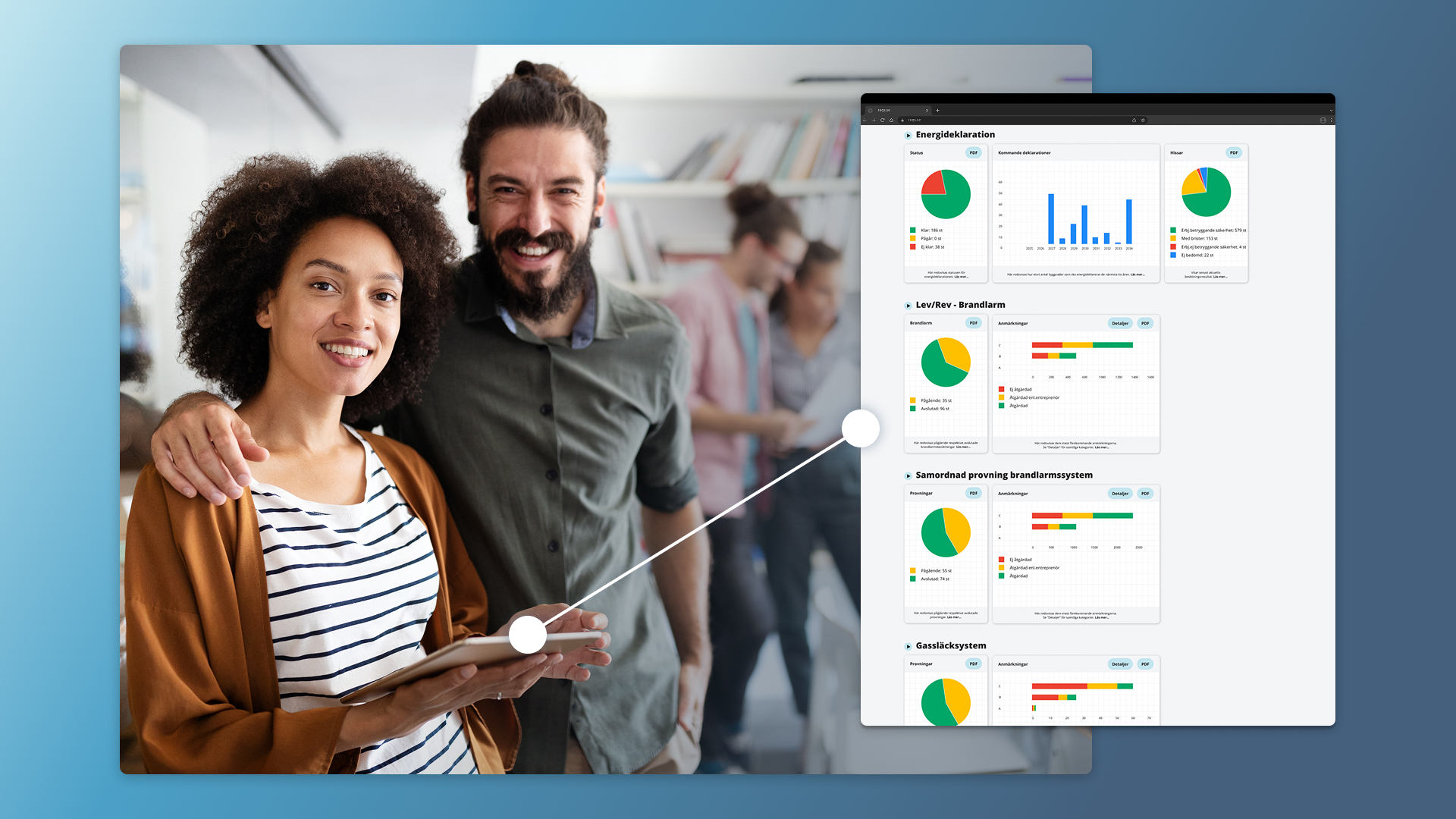 REQS Dashboard ger organisationen möjlighet att snabbt skapa sig en uppfattning av vad som är utfört eller inte, vilka anmärkningar/brister är åtgärdade eller inte.